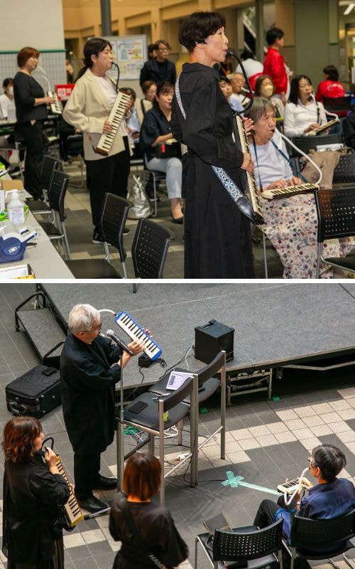 ジャズサキソフォン奏者で作曲家の宮浦清さんによる「鍵盤ハーモニカ(ケンハモ)音楽呼吸法」体験では、ケンハモ合奏を楽しみながら呼吸法を学びました。